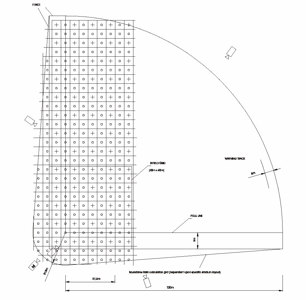 棒球場照明與其它運動照明的區(qū)別主要在于其燈桿位置與球場的相對位置的要求非常嚴(yán)格,棒球場上常用的固定攝像機位有6~7個之多,在職業(yè)棒球大聯(lián)盟的相關(guān)電視轉(zhuǎn)播標(biāo)準(zhǔn)中并沒有明確闡述其照度數(shù)值要求,其執(zhí)行過程中更多的是以水平照度要求為主。在滿足了聯(lián)盟提出的水平照度參數(shù)要求以后,電視轉(zhuǎn)播效果通常能得到很好的保證。