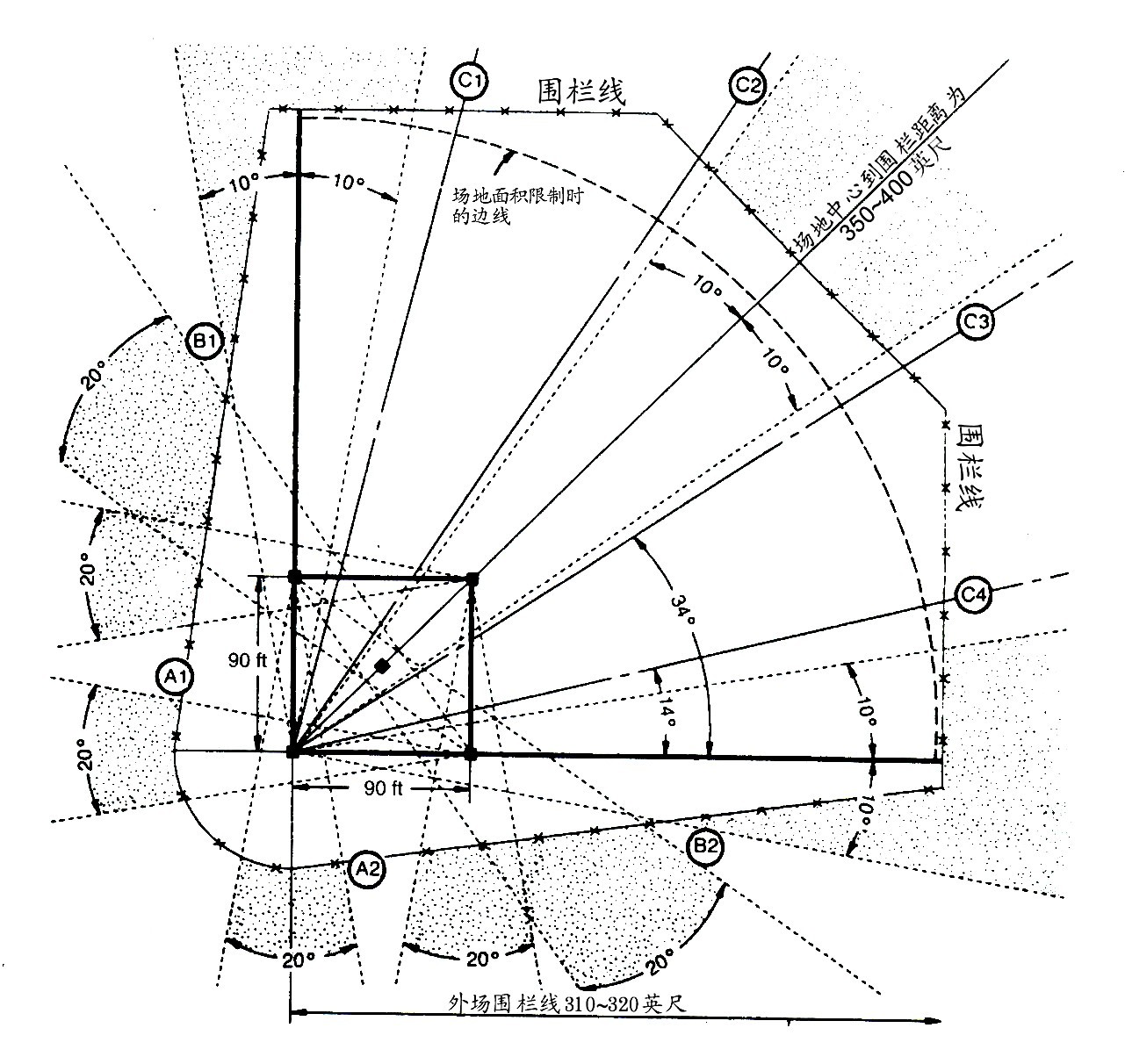 棒球的內(nèi)場尺寸為標(biāo)準(zhǔn)尺寸,而外場尺寸/區(qū)域卻各不相同。場地尺寸包括4.6米(15ft)的界外區(qū)。界外區(qū)認(rèn)為屬于運動區(qū)的一部分,應(yīng)該在照明設(shè)計中考慮該區(qū)域(見圖7-56)。大型和小型聯(lián)賽場將外界外區(qū)擴展到觀眾區(qū),可以朝外場方向逐漸縮小該界區(qū)。照明區(qū)域還需要包括候補隊員區(qū),球員休息區(qū)和熱身區(qū)。