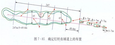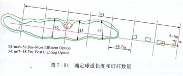 在圖7-84所示范例中,可以看出最后一要發(fā)球桿與果嶺前沿的距離341米,通過測量球道寬度后,發(fā)現(xiàn)球道平均最大寬度是40~50米,這說明需要的燈桿之間的間距為50~55米。