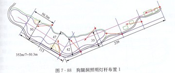 狗腿洞的照明設(shè)計。(見圖7-88)所示,通過前面所述的方法決定球道上燈桿的布置,沿狗腿洞外緣畫線以決定球道長度,用球道長度和寬度決定燈桿數(shù)量和間距。