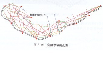 在球道中間的水域應(yīng)當與球道一樣對待,提供同樣的照明,因為球同樣必須穿過水面,同樣需要垂直照明度,不要試圖改變設(shè)計原則。(見圖7-93)