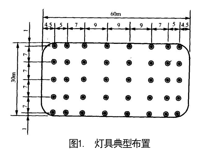 側(cè)向布燈的燈桿通常安裝在冰場側(cè)邊,并盡可能的在觀眾席后面(如下圖3),光源的高度不應(yīng)低于14m。如果燈桿離場邊較遠,燈桿的高度還要相應(yīng)的增加。