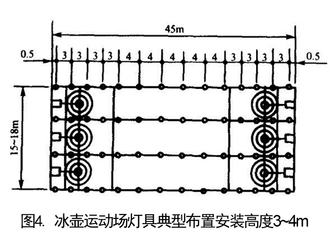 對冰壺冰場照明(如下圖4和5),光源的高度應(yīng)高于冰面3~4m。采用集中燈具,同樣要保證運動員不能受直接眩光以及由冰面引起的反射眩光的影響。根據(jù)冰壺運動。在兩端的收壺處需要較高的照度。因此,收壺處的球場燈布置比其它地方要密,或者在收壺處設(shè)置高輸出的球場照明燈,以達到收壺處高照度的目的。