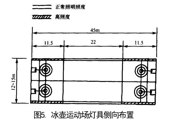冰上運動可以采用頂部照明方式,該布燈方式很容易滿足照度、照度均勻度和眩光控制的要求。冰場溫度較低,而燈具又有較高的溫度,這樣在燈具上容易形成冷凝水,冷凝水滴到冰面上會損壞冰面,因此,為了防止冷凝水滴到冰面上,應(yīng)特別注意燈具的位置和懸掛方式。側(cè)向照明布燈方式可以很好解決冷凝水滴到冰面上的問題,而且側(cè)向布燈更易于維修具有良好的垂直照度,物體立體感較好,并且更容易符合電視轉(zhuǎn)播和拍電影的要求。側(cè)向布燈更適合于速滑運動。