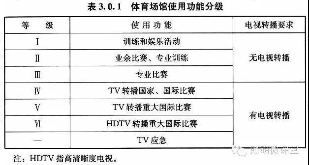 為體育場館做照明設(shè)計,我們首先要搞清楚的是照明級別。國標(biāo)對體育場館分級如下: