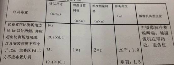 為避免運(yùn)動(dòng)員上方的高亮度,主賽區(qū)上方應(yīng)無燈具。一般,國(guó)際比賽要求的最小自由高度12米,因此,燈具安裝高度至少數(shù)12米,推薦采用金鹵燈。對(duì)于非正式比賽的羽毛球場(chǎng)館,場(chǎng)館的頂棚高度可以低些,當(dāng)頂棚的高度低于6米時(shí),可以使用熒光燈進(jìn)行照明。金鹵燈燈具宜用中光束。具體燈具布表7。