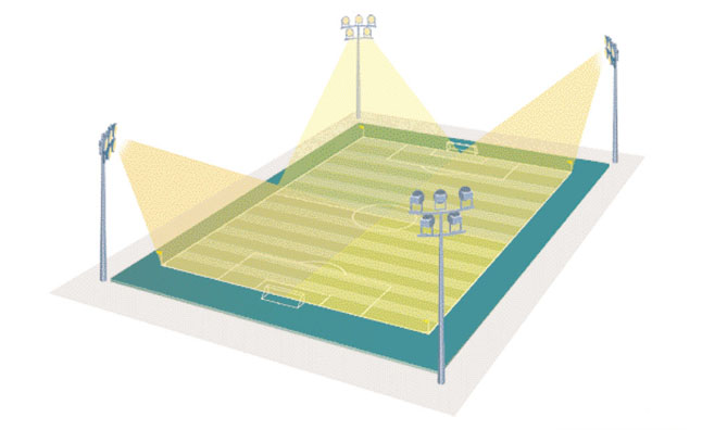 按照球場均勻不光,布燈與球場四角;裝4組燈,每組高桿燈上裝5盞投光燈。