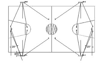 1. 宜以帶型布類置于球場兩側(cè),并應(yīng)超出比賽場地端地1米。 2. 燈具安裝不應(yīng)低于是12米。 3. 以藍(lán)框?yàn)橹行闹睆?/span>4米內(nèi)的圓區(qū)上方不應(yīng)布置燈具。 4. 燈具瞄準(zhǔn)角度盡量低于65度。 5. 藍(lán)球場兩側(cè)正面不能布置燈具直身球場。 |