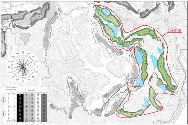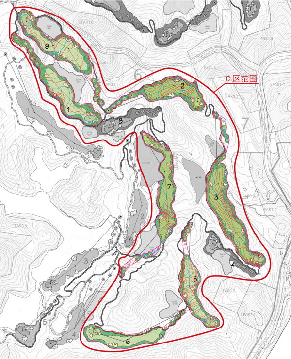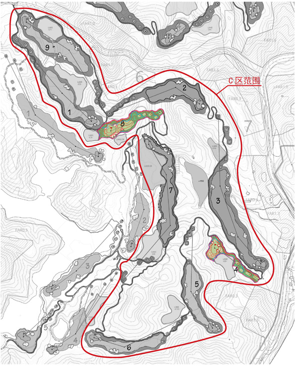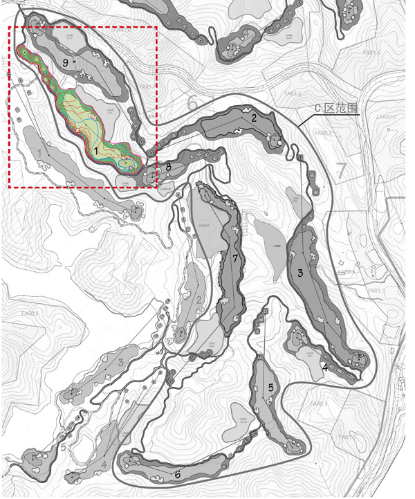 星河山海半島高爾夫球場(chǎng)共分為A、B、C 三個(gè)場(chǎng),本次設(shè)計(jì)燈光設(shè)計(jì)范圍為C 區(qū)(如下圖紅色標(biāo)線區(qū)域)。C 區(qū)共分為9 個(gè)球洞,每個(gè)球洞都充分利用現(xiàn)有地形條件,與自然地貌融合一體,形成獨(dú)具特色的球洞設(shè)計(jì)。其夜景燈光照明需根據(jù)每個(gè)球洞不同的地形條件,進(jìn)行相對(duì)應(yīng)的優(yōu)質(zhì)燈光照明設(shè)計(jì)方案。