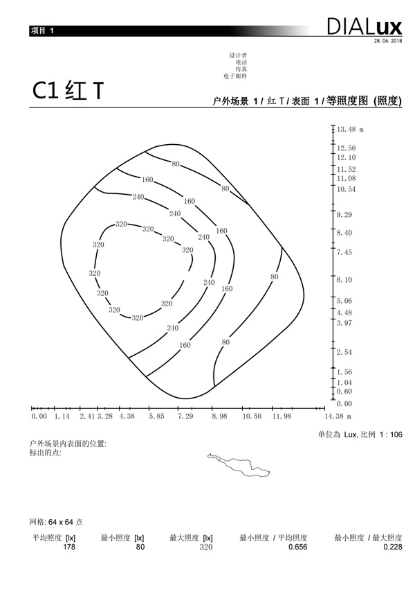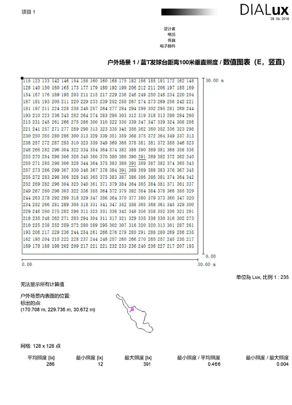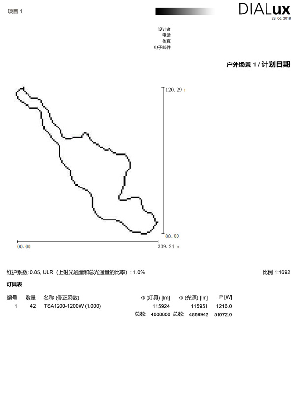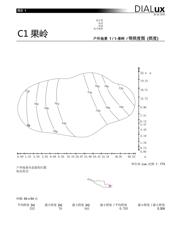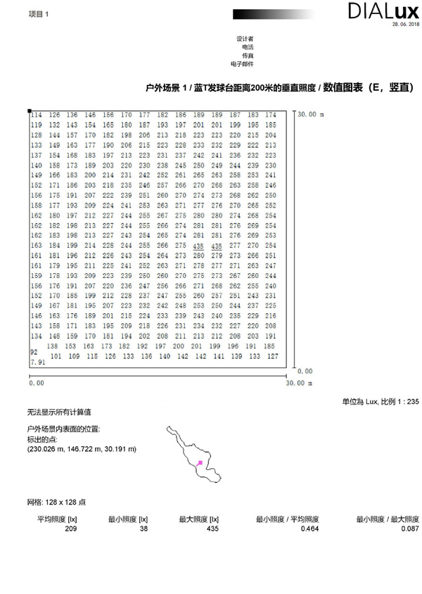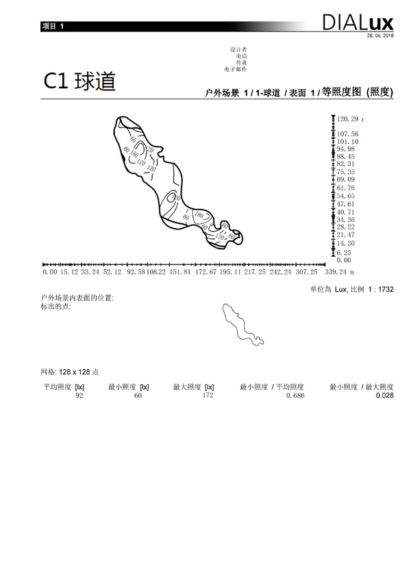 其中球道半徑超過(guò)60 米的超寬球洞有7 個(gè),分別為C1、C2、C3、C5、C6、C7、C9 號(hào)球洞。根據(jù)高爾夫球場(chǎng)燈光設(shè)計(jì)原則,此類型球場(chǎng)采用18 米高燈桿,球道燈具布置采用雙邊對(duì)稱式布燈,從球道兩側(cè)同時(shí)提供照明, 以達(dá)到照度標(biāo)準(zhǔn)技術(shù)要求。