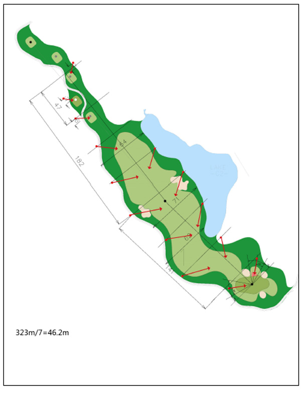 C4、C8 號(hào)球洞的寬度在60 米以下,根據(jù)高爾夫球場(chǎng)燈光設(shè)計(jì)原則,此類型球場(chǎng)采用15 米高燈桿,球道燈具布置采用雙邊交錯(cuò)布燈的方式,根據(jù)每個(gè)球洞的具體地形,進(jìn)行燈具燈桿的布置。