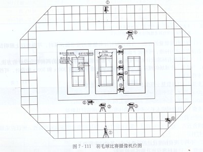 大型羽毛球比賽電視轉(zhuǎn)播的機位圖如圖:7-111所示,該圖與表7-55配合使用。